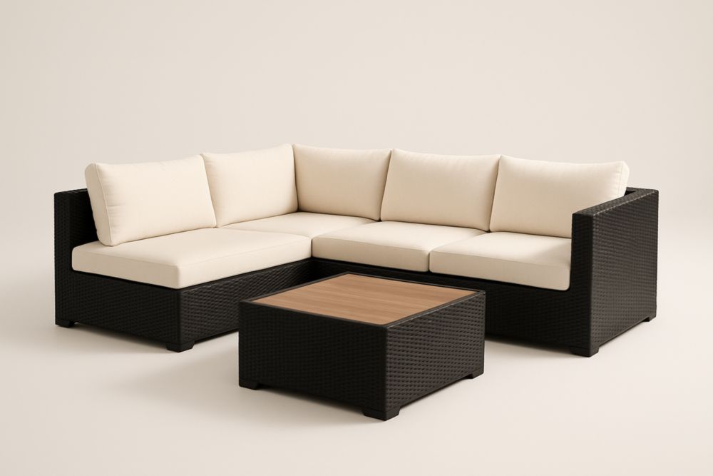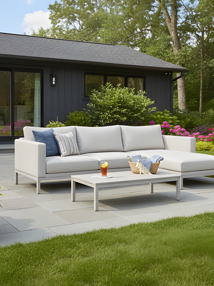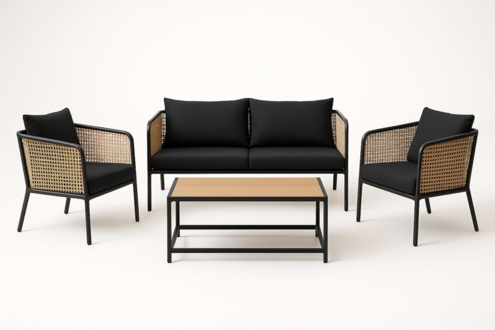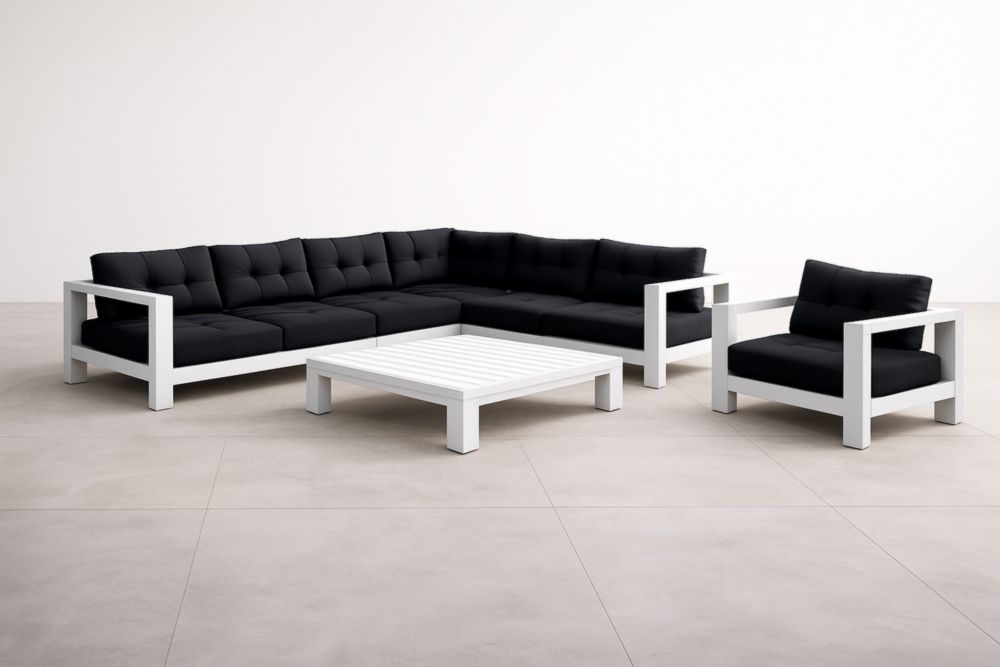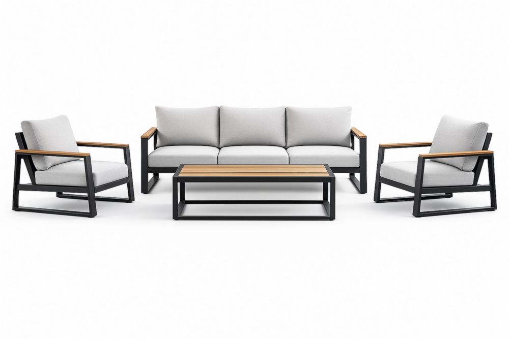 Matériaux: Cadre en aluminium, coussins en tissu polyester, accoudoirs en bois massif.